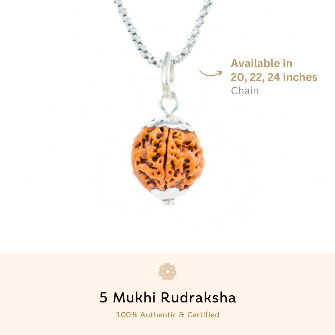 Harness spiritual energy and protection with the 5 Mukhi Rudraksha Silver Capping Pendant. Crafted with authentic 5 Mukhi Rudraksha and premium silver, this sacred pendant promotes positivity, strength, and balance—ideal for daily wear and meditation.