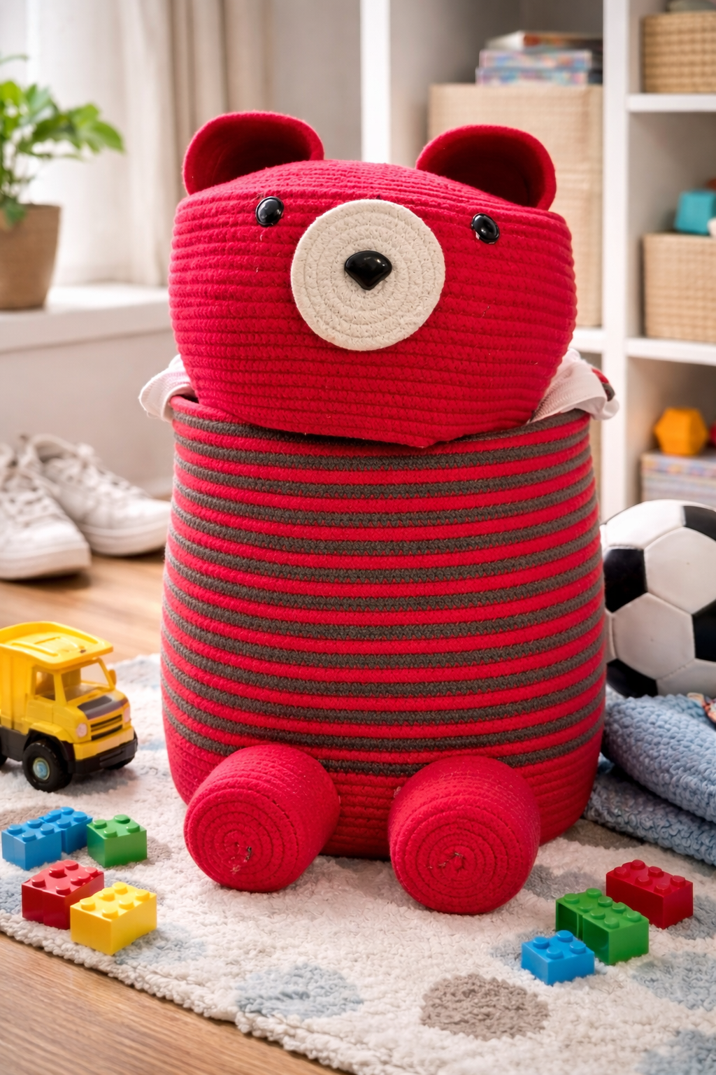 Its sturdy cylindrical shape offers ample space for storing toys, laundry, blankets, books, or accessories, while the neutral rope color blends easily with different interior styles. Both decorative and practical, this basket helps keep spaces organized without compromising on style. Ideal for parents looking for smart storage or fans who love bold, character-inspired accents.