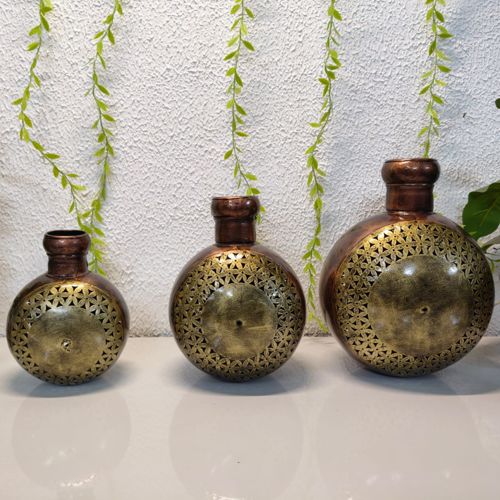 Beautifully handcrafted jali kudiya tealight holders with intricate cutwork design, finished in an antique tone to create a warm and elegant glow in your living space.