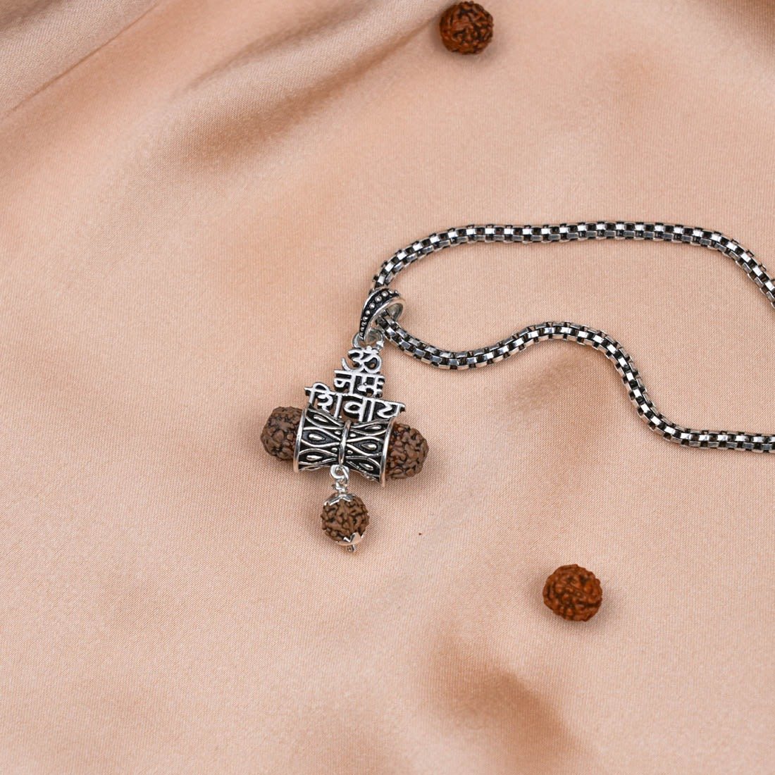 Invoke divine blessings with the Rudraksha Om Namah Shivay Damru Pendant. Crafted with authentic Rudraksha and premium silver, this sacred pendant embodies devotion, protection, and spiritual energy—perfect for daily wear, meditation, and pooja.