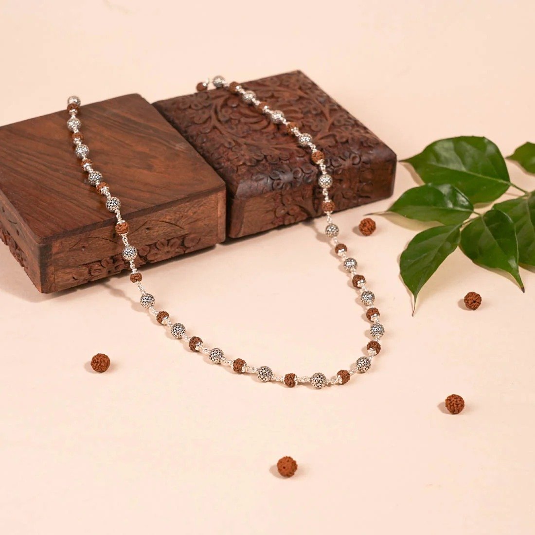 Rudraksha is deeply revered in Indian culture for its powerful spiritual and healing properties, believed to calm the mind, enhance concentration, and invite positive energy. The uniquely designed square silver beads add a modern yet sacred touch, making this mala both meaningful and visually distinctive.